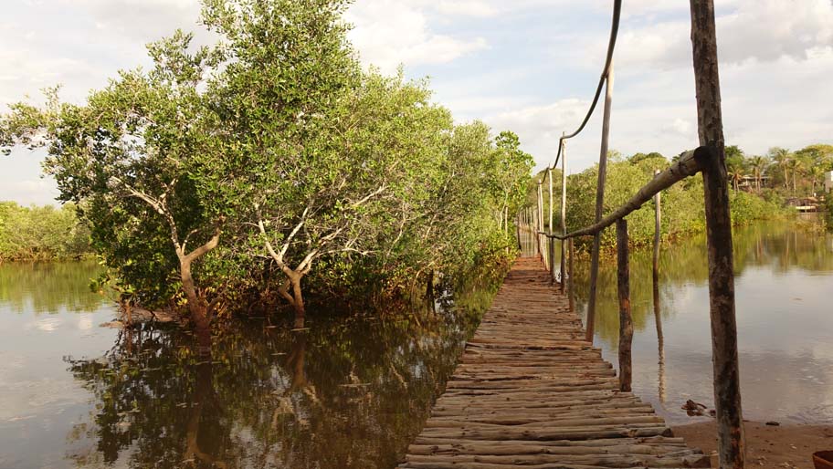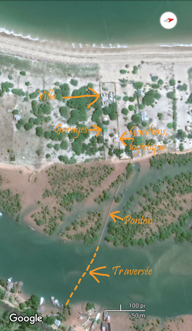 Cette presqu'ile ne possede pas de route. L'acces est réalisé en 4X4 par la plage ou par une pittoresque traversée en barque pour la centaine de mètres qui sépare le village des pécheur de la mangrove. Ensuite, jusqu'au terrain, c'est la marée qui décide : les 100M restant se continuent en barque à marée haute et par un ponton en bois à marée basse.